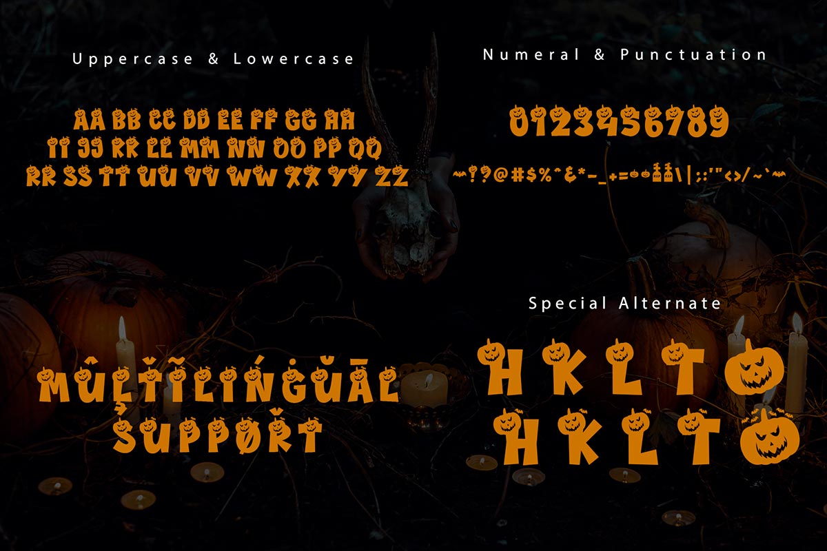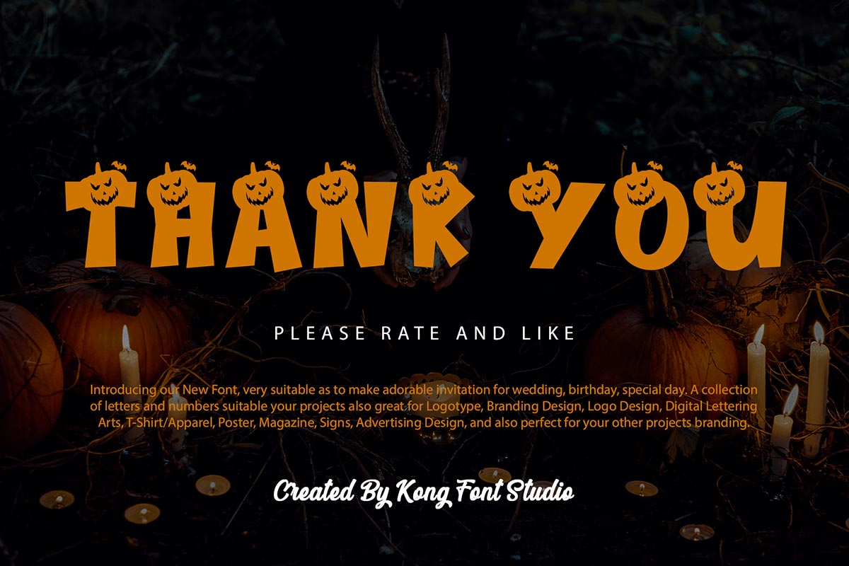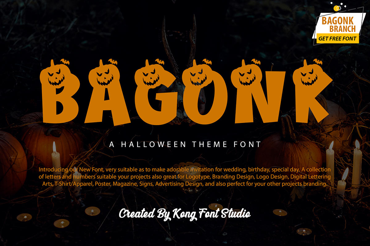Bagonk Fancy Font Bagonk presents a very unique and an interesting look for a decorative typeface. It is a variation of Halloween decorative fonts. Not only shaped in the form of regular letters but the typeface itself is also equipped with the addition of a mysterious-looking pumpkin and a small bat on top of the letters. Speaking of readability, each of Bagonk's character glyphs has a wide and clean look, so they can clearly be distinguished from each other and is suitable for large-size printing. The Bagonk typeface is designed to jazz up your Halloween event with your family and friends. You can use this font on your Halloween invitations, as well as banners and posters that you will display at your party. You can also use Bagonk on other Halloween supplies, such as; t-shirts, mystery story books, and party favors. Companies that produce items with a Halloween theme can also use this font on their products, such as; on children's toys, school bags, hats, and more. Bagonk fonts can also be used as decorations in places frequented by people such as; shopping centers, restaurants, hotels, and many other places before and during Halloween.Our collection of display fonts and compatible to use as Figma fonts, Canva fonts, Freepik Fonts, and Adobe Fonts. They also work as Windows Fonts, and Apple Fonts. For your social media needs, you can use and install fonts in our collection of display and decorative typefaces to use as Instagram Fonts, Facebook Fonts, and Twitter Fonts.
